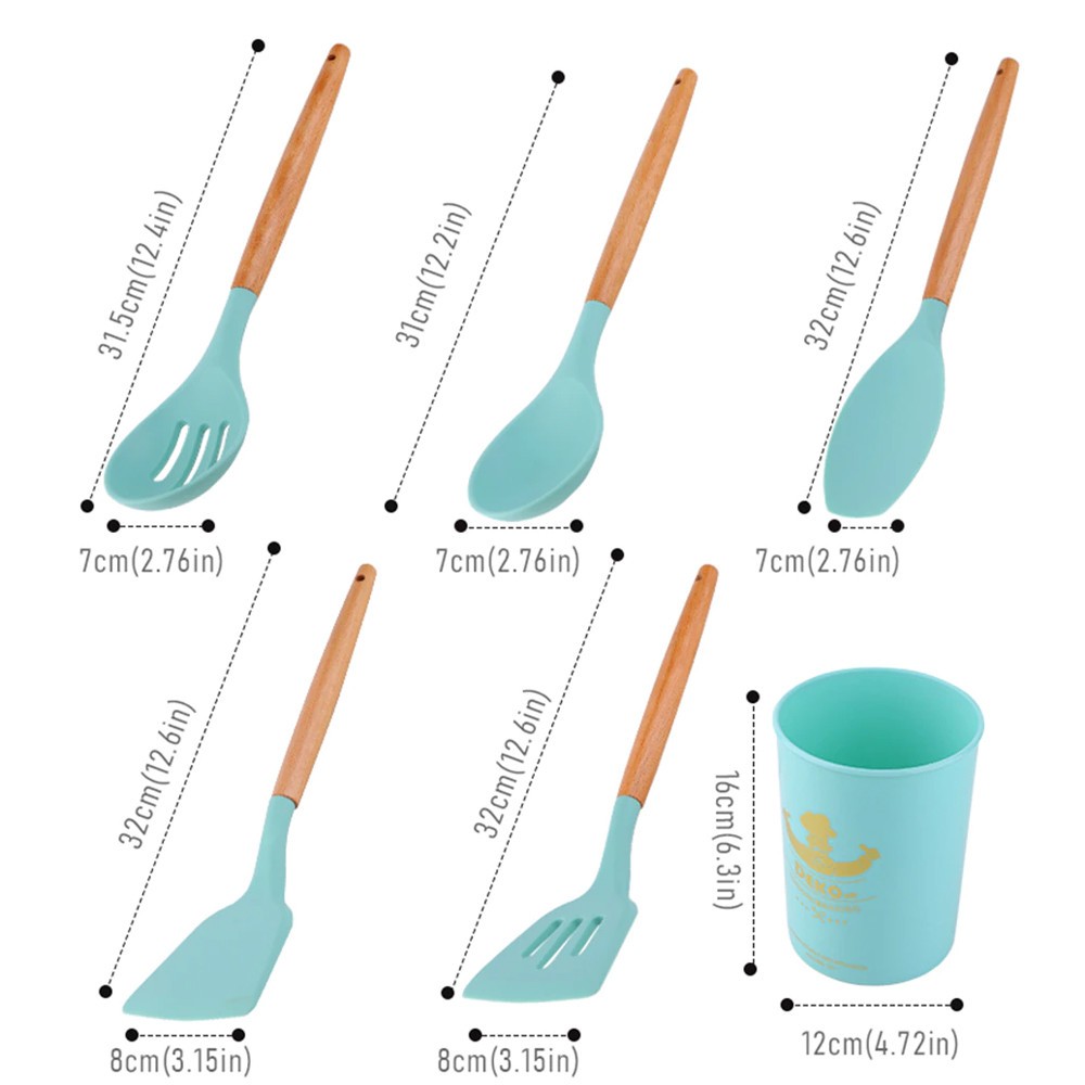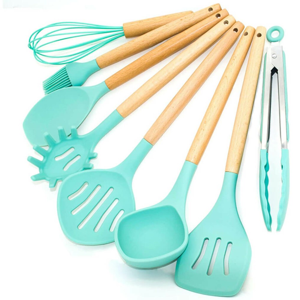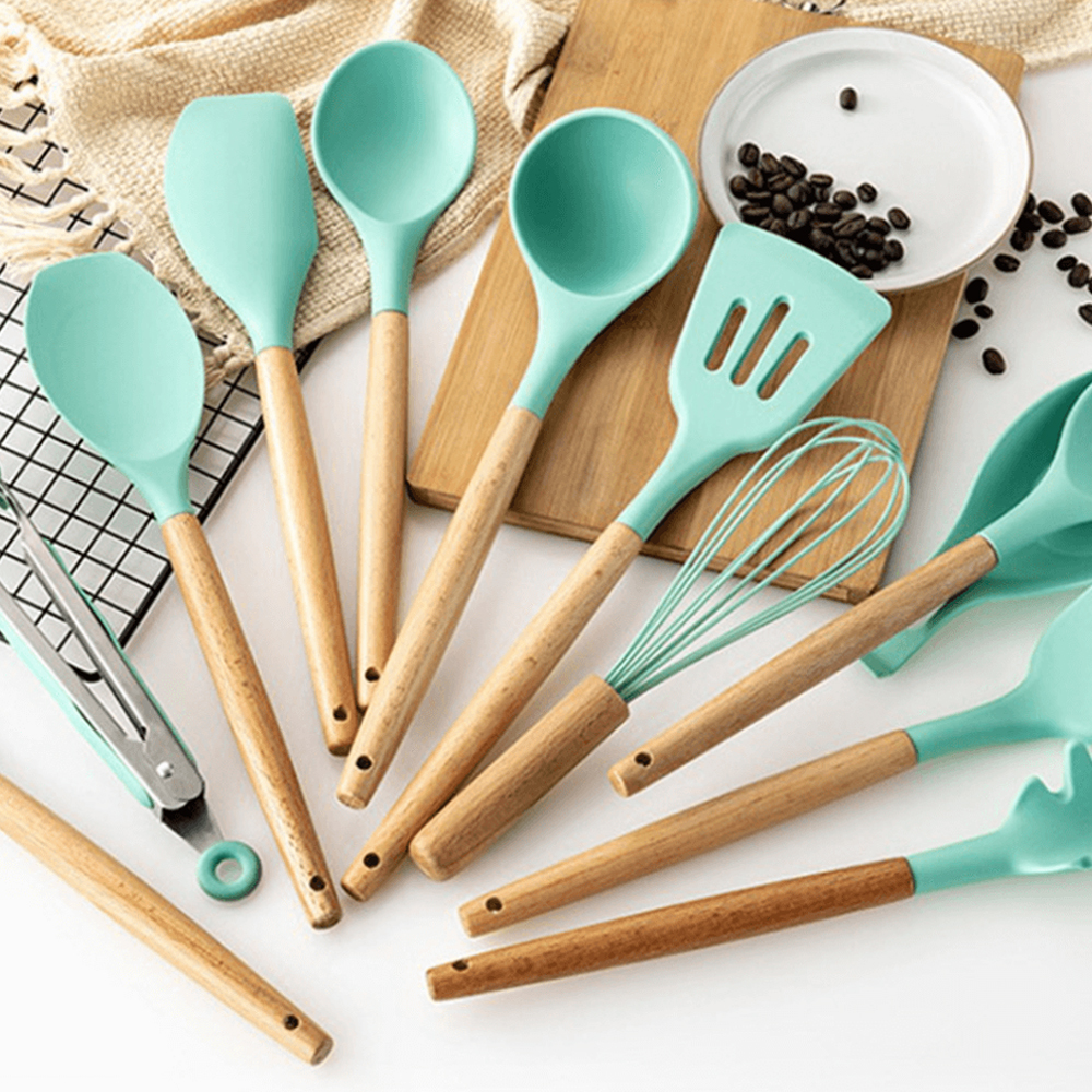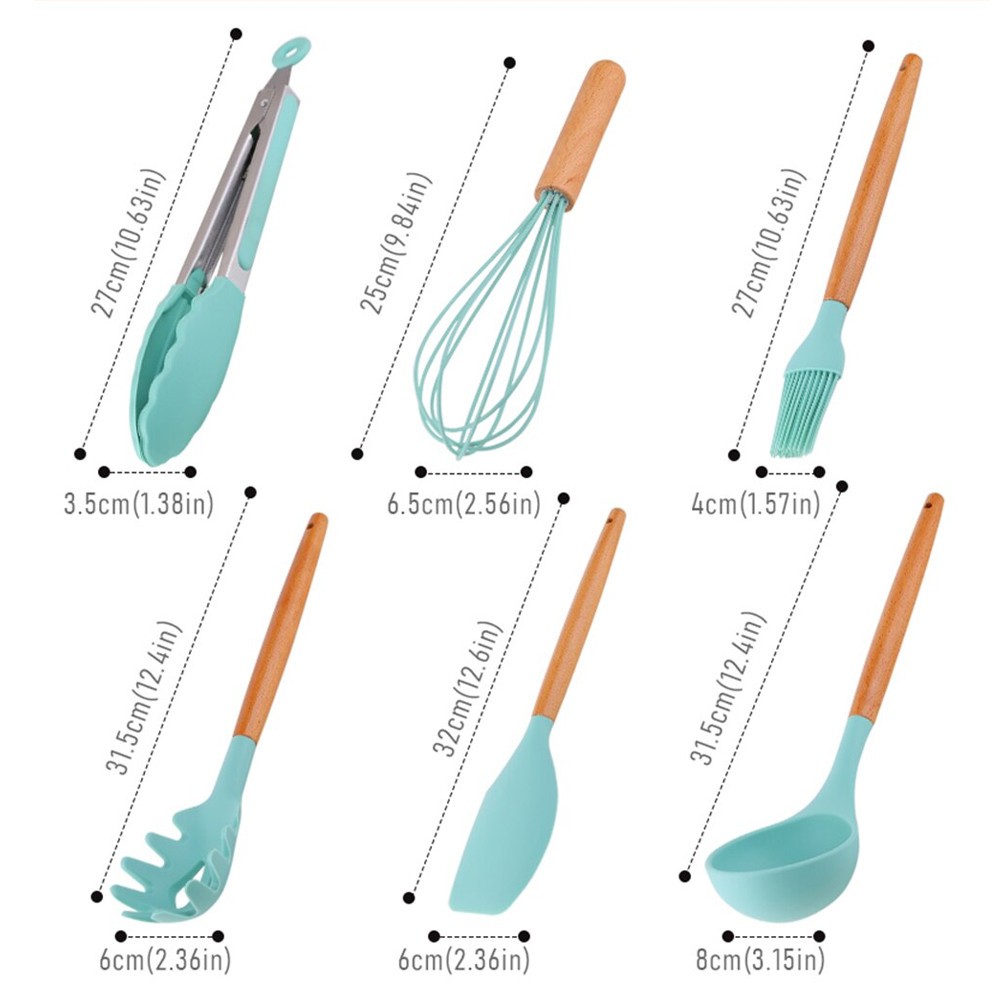 Každá z 12-dielnej súpravy je vyrobená z kvalitného silikónu a má pevnú drevenú rukoväť, ktorá je plne odolná voči teplu a po použití nevybledne. Veľkou výhodou silikónu je, že môžete použiť aj teflón a čistenie je veľmi jednoduchá úloha.