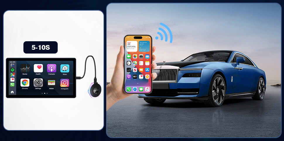 Tento bezdrôtový adaptér CarPlay vás oslobodí od spleti káblov a umožní vám využívať pohodlie bezdrôtového CarPlay. Je navrhnutý s najnovším 5,8GHz modulom Wi-Fi, ktorý poskytuje prevádzku bez oneskorenia a vynikajúcu kvalitu zvuku. Môžete využívať všetky funkcie CarPlay pri zachovaní pôvodných funkcií vozidla, ako je navigácia, prehrávanie hudby, asistent Siri, telefonovanie atď. Podporuje aj hlasové ovládanie, ovládanie na volante a ovládanie tlačidlami.