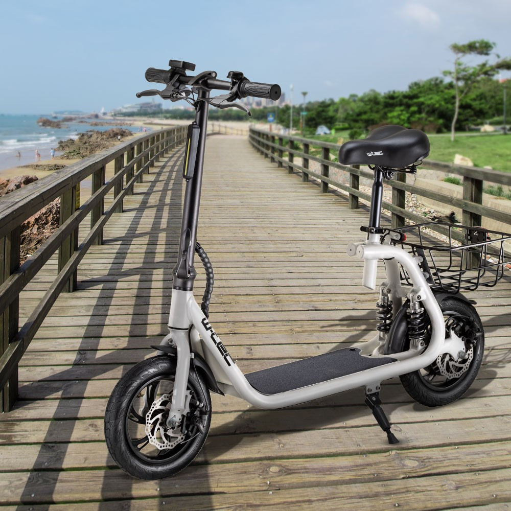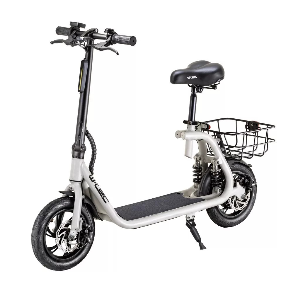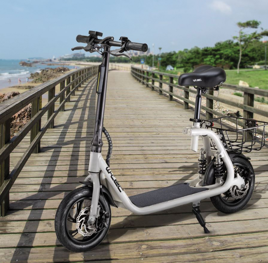 Elektrická kolobežka s odnímateľným sedadlom a praktickým košíkom-bielá