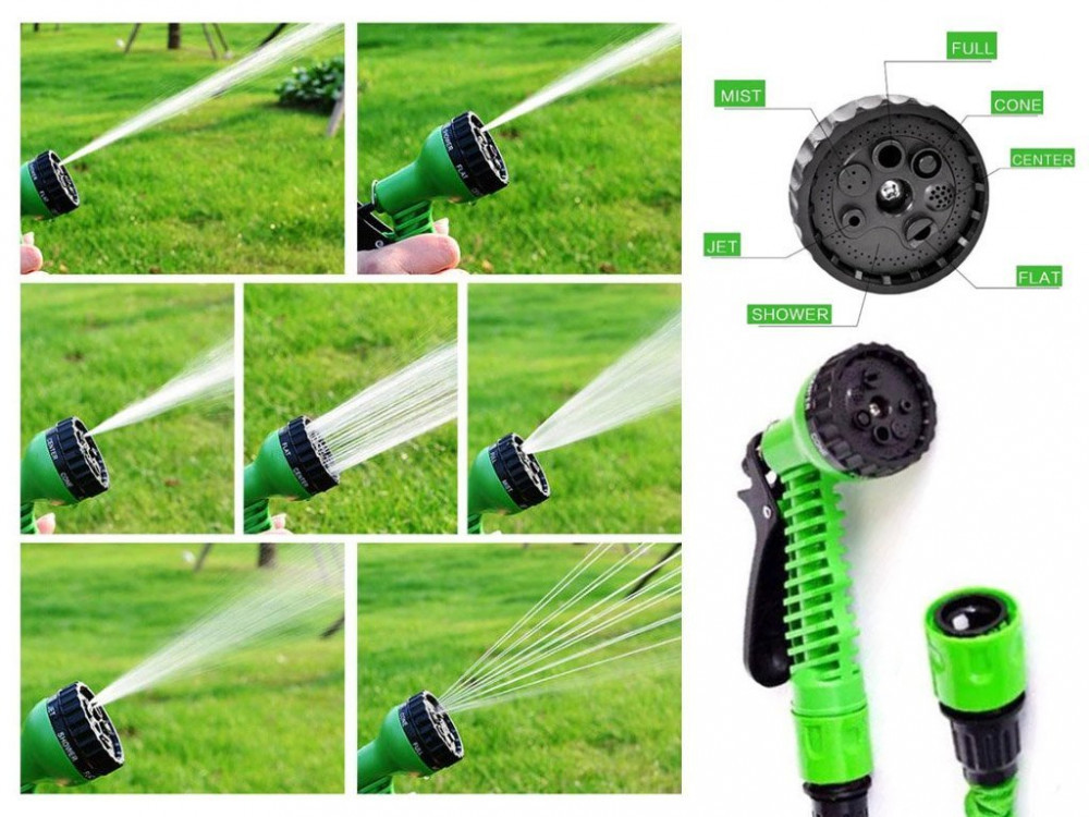 Vysokokvalitná tryska so samonavíjacou sa flexibilnou hadicou. Jednoduché nastavenie prietoku vody a typu postrekovača. Po naplnení vodou sa hadica môže predĺžiť až na trojnásobok svojej dĺžky. Kombinácia vysoko flexibilnej postrekovacej hadice a kvalitnej a mimoriadne odolnej tkaniny zaručuje, že hadica je dokonale roztiahnuteľná. Ideálna na prácu v záhrade, umývanie auta, čistenie kobercov a podláh.