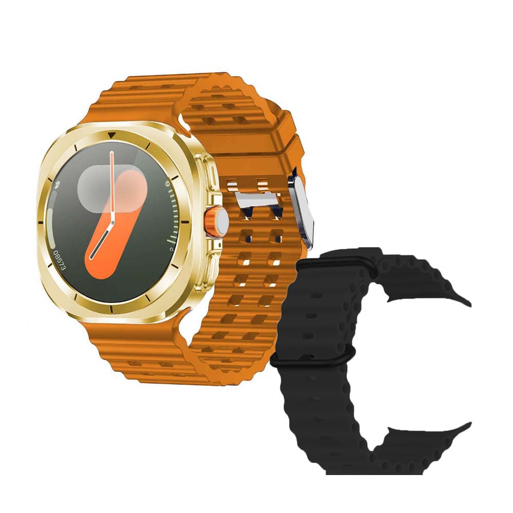 Inteligentné hodinky A25 Ultra so zlatým rámom - oranžovým a čiernym silikónovým remienkom