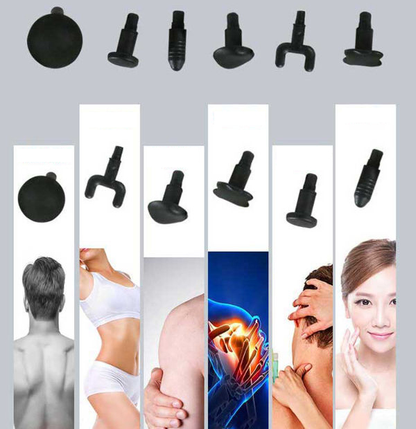 Masážna pištoľ má 6 vymeniteľných hlavíc, ktoré možno použiť na rôzne masážne techniky.