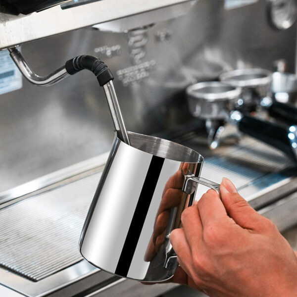 Táto nerezová mliečna kanvička je ideálna pre prípravu cappuccina, latte alebo iných kávových nápojov. Vďaka stabilnej a pevnej konštrukcii je odolná a praktická na každodenné použitie doma aj v kaviarni.