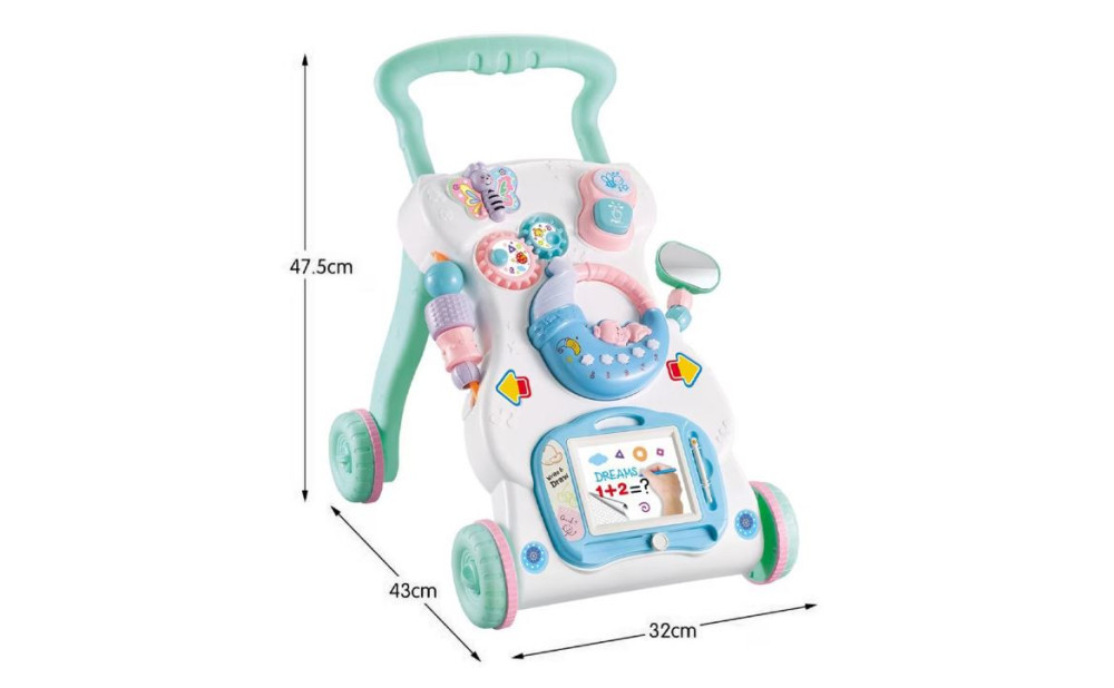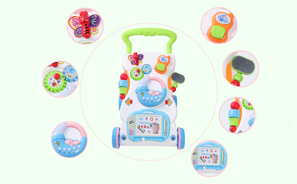 7 multifunkčných hračiek: svietiace piano, otáčacie koleso, obojstranný motýľ, mini telefón, zrkadlo, posuvné počítadlo a magnetická tabuľa na kreslenie.
