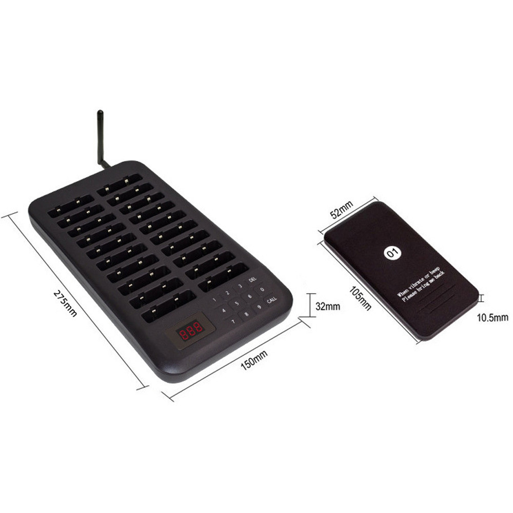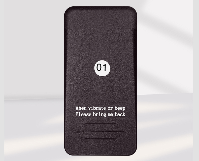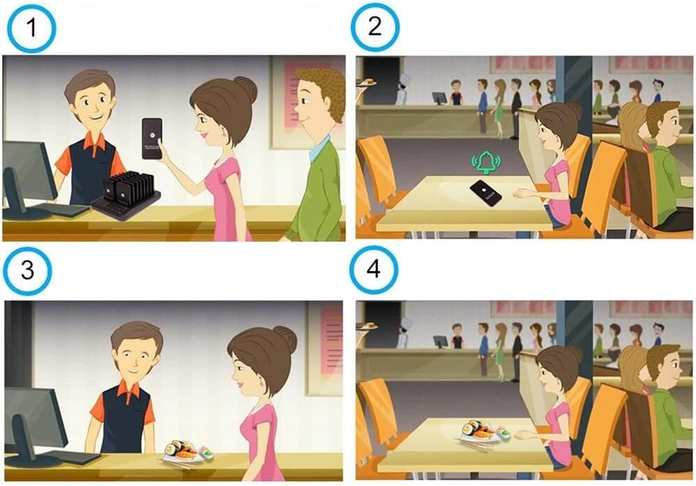 Reštauračný pager ponúka tri režimy upozornenia: vibrácie, zvukový alarm a blikajúce svetlo. Čas upozornenia možno flexibilne nastaviť v rozmedzí 1 až 999 sekúnd, takže hostia môžu byť v rôznych častiach reštaurácie alebo sa prechádzať, kým ich zariadenie upozorní, že ich jedlo je pripravené. Dosah zariadenia je 100 metrov.