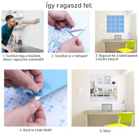 Pred aplikáciou sa uistite, že stena kde ju chcete umiestniť je bezprašná a nemastná, inak nebude dlho držať. Na jednotlivých samolepkách nájdete modrú ochrannú fóliu, ktorú musíte pred lepením odstrániť