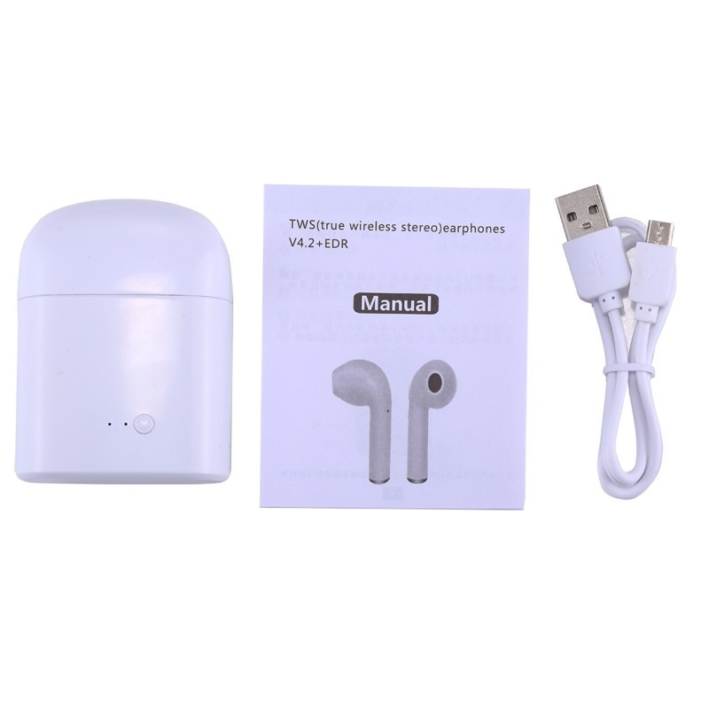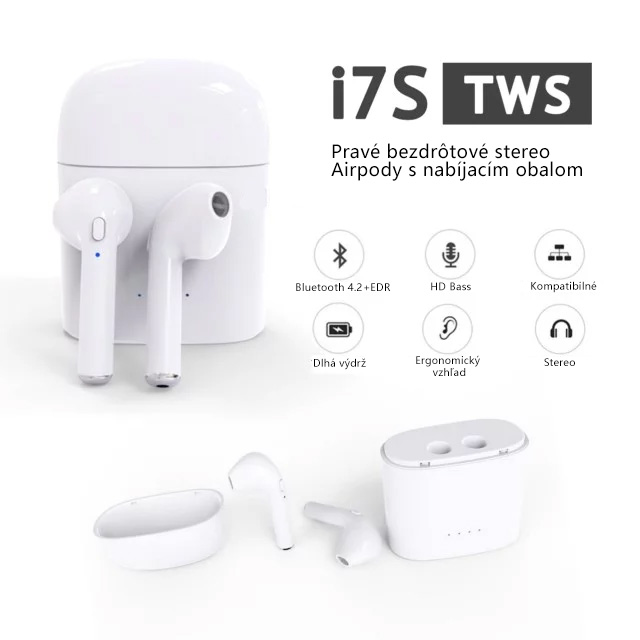 Bezdrôtové bluetooth slúchadlá i7s s mikrofónom kompatibilné s mobilnými telefónmi so systémom iOS a Android. V balení sa nachádza nabíjacie púzdro, vďaka ktorému môžete slúchadla kedykoľvek a hocikde dobiť v prípade potreby. Slúchadla dokážu prijať alebo odmietnuť prichádzajúci hovor a taktiež dokážete ovládať svoju hudbu.i7s