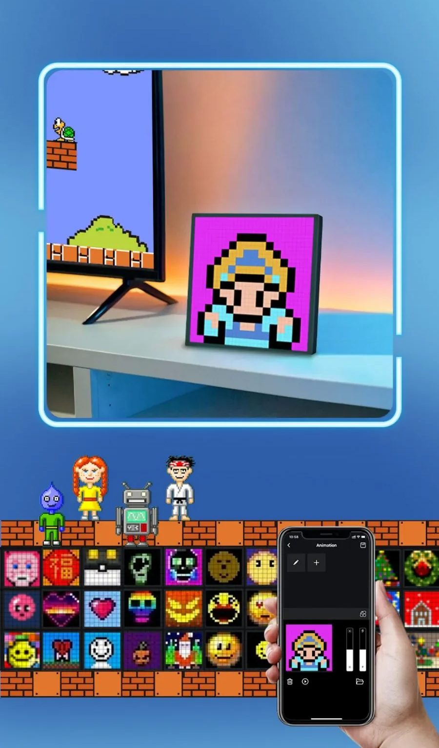 Pixle Photo Frame: má 16x16 plnohodnotný RGB LED panel. Pomocou inteligentnej mobilnej aplikácie iDotMatrix ho možno premeniť na plátno Pixel Art, inteligentný budík, odpočítavacie LED hodiny, billboard, nočné svetlo a všestranné zariadenie