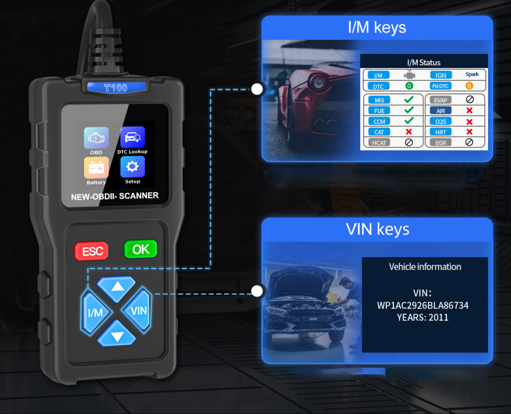 - I/M tlačidlá: Stav I/M kontroluje fungovanie emisného systému u OBDII-kompatibilných vozidiel. Skvelý nástroj na overenie zhody vozidla s národnými emisnými normami.