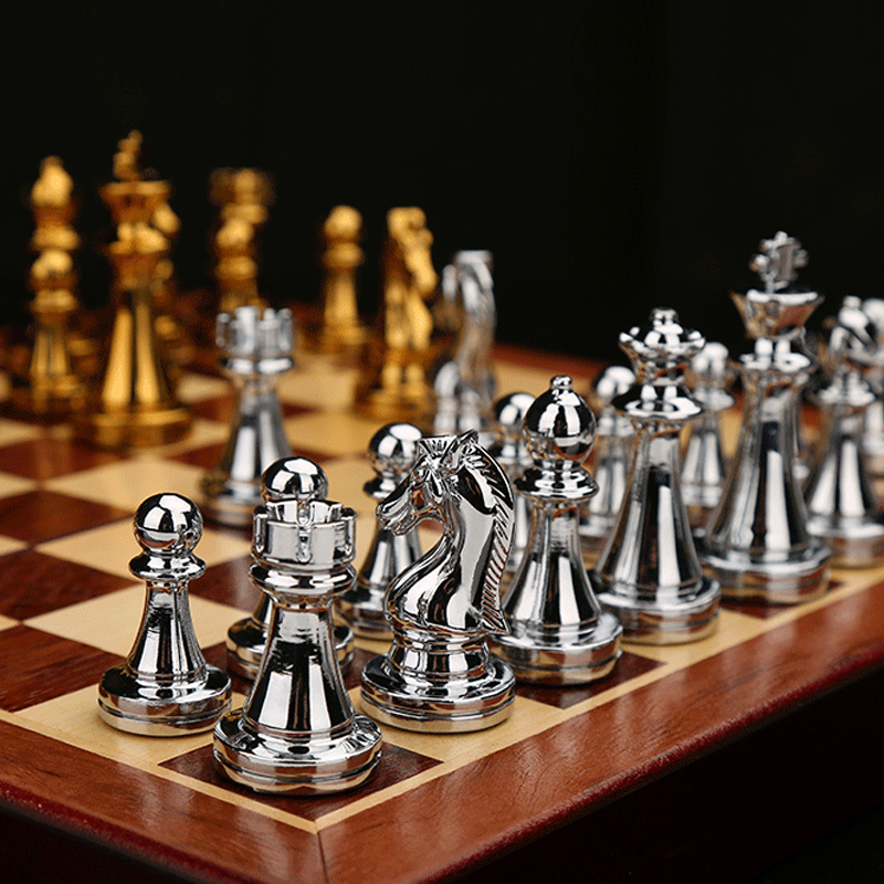 Vintage šachová súprava v skladacej šachovnici - ktorá obsahuje zlaté a strieborné šachové figúrky