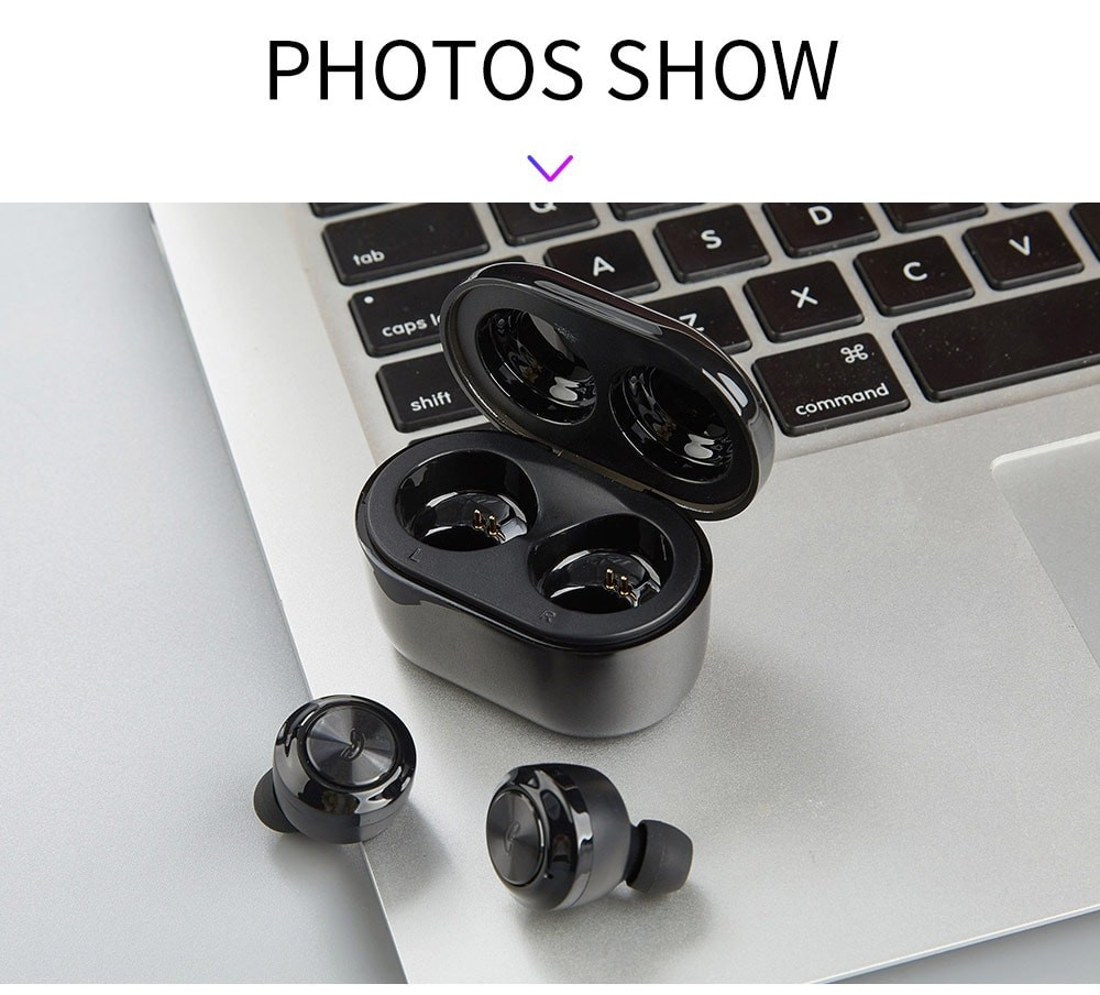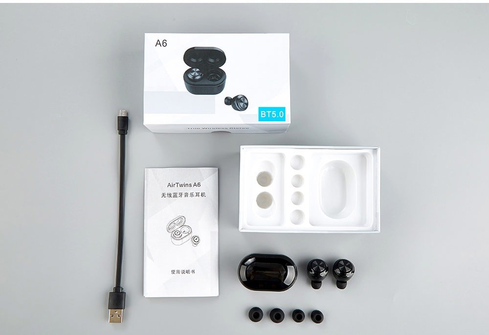 A6 bluetooth bezdrôtové slúchadlá s puzdrom na nabíjacím púzdrom.
